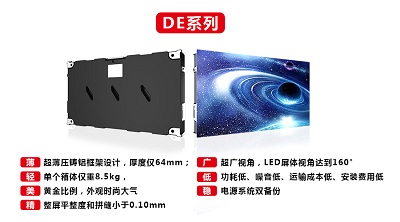 銳尚系列顯示屏每塊模組均擁有獨立主控芯片,能夠自動讀取和記錄模組的工作數(shù)據(jù),同時具有錯誤偵測和定位等功能。小間距DE系列顯示屏設(shè)計輕薄,有效減少屏體安裝空間。