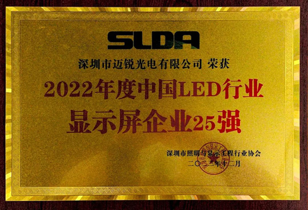 再次獲得“2022年度中國LED顯示屏行業25強企業”獎項,體現了行業對邁銳光電在過去一年在顯示科技水平以及項目設計方案等方面所取得成績的高度認可,尤其是在顯示科技水平和項目設計方案方面,贏得了業界的廣泛贊譽。